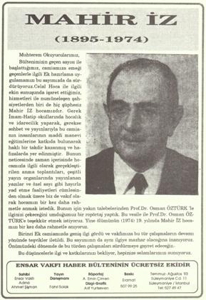 Geçen hafta sonu köye gittiğimizde, tavan arasından indirdiğimiz eski dergi, gazete ve kitaplar arasında Mâhir İZ Üstâdımızı anlatan bir broşürle karşılaştım. Bir çırpıda okudum yeniden. ENSAR VAKFI haber bülteninin ücretsiz eki olarak verilmiş 1993 yılı temmuzunda. Meğer, bir-kaç gün sonra üstadımızın ölüm yıldönümüymüş. Üstâd’ın en yakın talebesi olan ve bizim de İstanbul Yüksek İslâm Enstitüsü’nden hocamız olan Prof. Dr. Osman ÖZTÜRK’le yapılan röportajdan oluşuyor broşür.