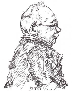 Evet, şiir ve hikâyesi böyle. Kısa bir şiir ama, Sıtkı ÇEBİ’yi, genel çizgileri ve fotoğraf îtibârıyle güzel resm’etmiş. Resim dedik de, bir de resim var gördüğünüz gibi. Şiir de, resim de, söz konusu dâvetiyenin arkasında yer alıyor! Dedik ya dâvetiyeyi en güzel şekliyle değerlendirmiş diye! Çarşamba Gecesi Üstada bakarak çizilmiş. Herhâlde, üstâdı diğer konuşmacılardan birini dinlerken resm’etmiş olmalı. Ama, ne kadar güzel, sevimli, tonton, sempatik ve aynı zamanda karizmatik çizmiş, değil mi? Hem, öyle sâhici ki, tanıyan her kim görse; “bu, o” der!