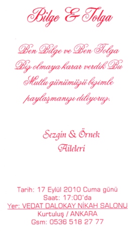 Çok sâde, ağırbaşlı, maksâda uygun, desen, çizgi ve muhtevâsıyla, sevimli, şipşirin bir dâvetiye. Öyle âhım-şâhım, cicili-bicili, süslü-püslü, kurdelâlı-jelâtinli, mutantan bir dâvetiye değil. Ama bana göre bu dâvetiye, asıl önemli olan şeyin; içi, sevgi-saygı dolu bir yuvaya atılan bir adımın göstergesi. Gösteriş ve âlâyişten, dışa karşı sergilenme ihtiyâcından doğan yapmacık hareketlerden uzak, arınmış, oturmuş, olgun ve gerçek bir mutluluğun habercisi gibi.
